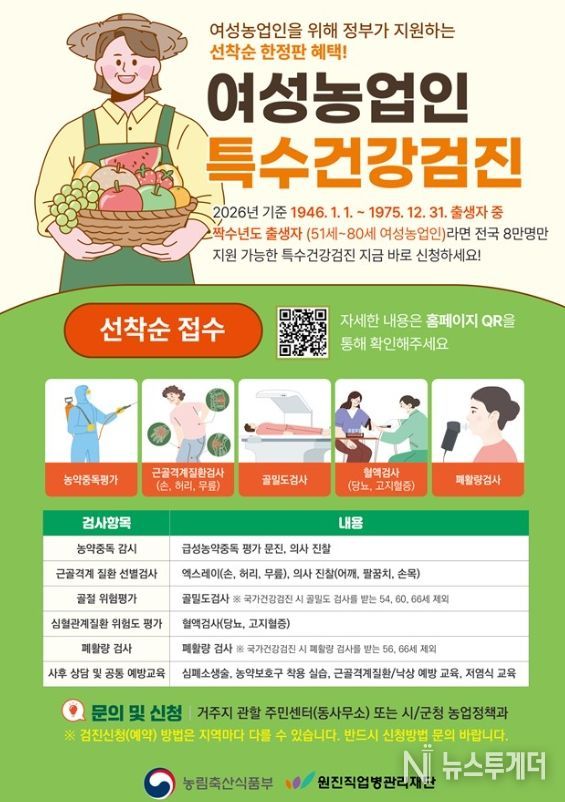 뉴스투게더 김인숙 기자 | 기장군은 여성농업인의 건강 증진과 복지 향상을 위해 ‘2026년 여성농업인 특수건강검진 지원사업’을 본격 추진한다고 22일 밝혔다.