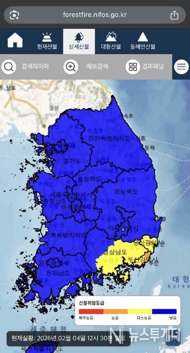 뉴스투게더 김인숙 기자 | 산림청 국립산림과학원은 2월부터 사용자가 자신의 현재 위치를 기반으로 산불위험 정보를 실시간으로 확인할 수 있는 '국가산불위험예보시스템'을 모바일 반응형으로 전환하여 제공하고 있다고 밝혔다.