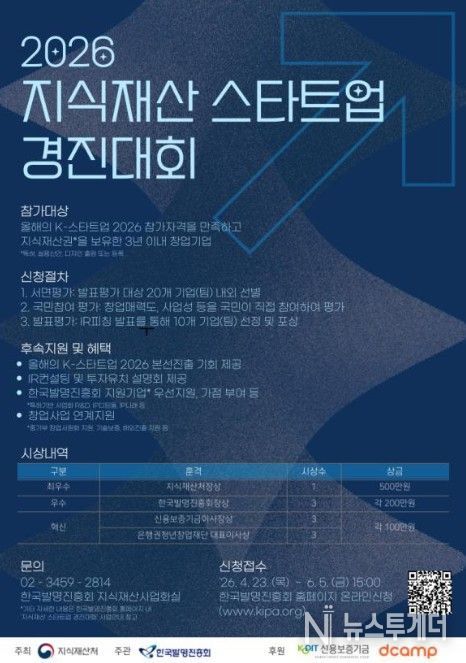 뉴스투게더 김성연 기자 | 지식재산처는 신용보증기금, 은행권청년창업재단(디캠프), 한국발명진흥회와 함께 4월 23일 ~ 6월 5일까지'2026 지식재산 스타트업 경진대회'참가기업을 모집한다고 밝혔다.