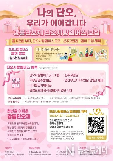 위원회 관계자는 “단오사랑 멤버스는 단순한 후원을 넘어 시민이 직접 축제의 주체가 되어 천년 전통을 이어가는 참여형 프로그램”이라며 “많은 분들의 관심과 참여를 통해 강릉단오제가 더욱 풍성한 축제로 발전하길 기대한다”고 말했다.