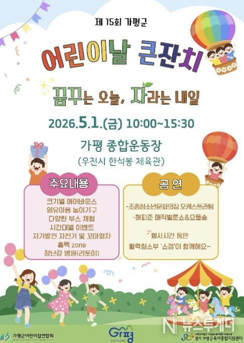 뉴스투게더 김인숙 기자 | 가평군은 오는 5월 1일 오전 10시 가평종합운동장에서 ‘제15회 가평군 어린이날 기념행사’를 개최한다. 가평군어린이집연합회와 가평군육아종합지원센터가 공동 주관하는 이번 축제는 기념행사와 공연, 놀이, 체험 부스 등 다채로운 프로그램으로 꾸며진다.