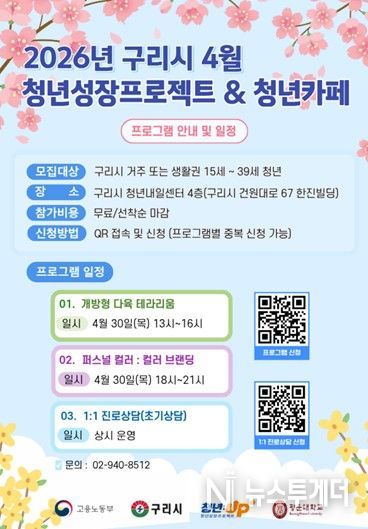 이번 4월 프로그램은 구리시에 거주하거나 생활권을 둔 15세부터 39세까지의 청년을 대상으로 하며, 구리시 청년내일센터 4층에서 진행된다. 참가비는 무료이며 프로그램별 중복 신청이 가능하다. 다만 모집은 선착순으로 마감된다.