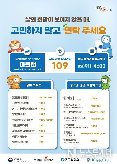 뉴스투게더 김인숙 기자 | 동구보건소는 봄철 자살 고위험 시기(3월~5월)를 맞아 생명존중 문화 확산과 자살예방을 위한 집중 관리 및 홍보를 추진한다고 밝혔다.
