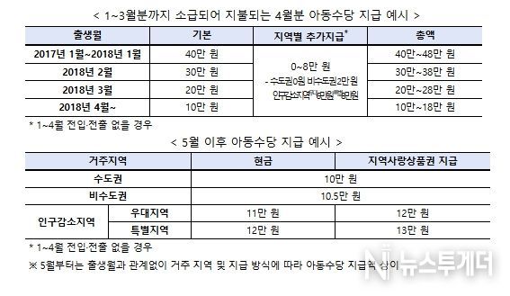 정부는 3월 20일 개정 '아동수당법' 공포 이후 아동수당 지급 연령 확대와 지역별 추가 지급을 위해 시스템을 개선했고, 문자·우편 등으로 아동수당 지급이 중단된 2017년 1월생 ~ 2018년 3월생 아동의 지급정보를 확인하여 별도의 신청 없이 지급하기 위한 절차를 진행했다.