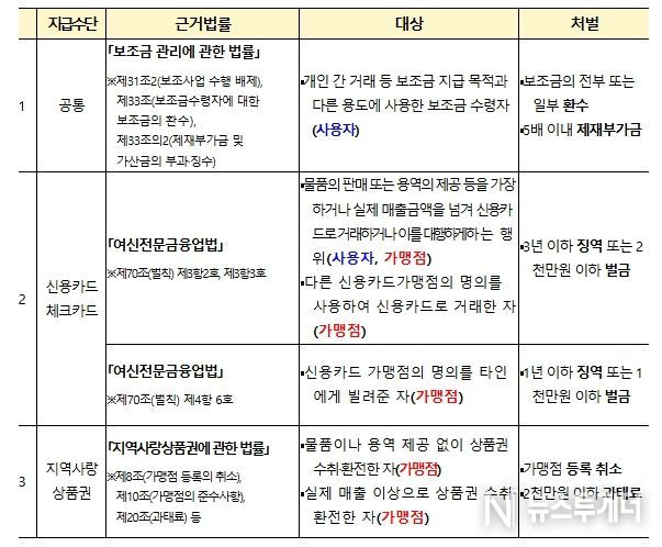또한, 지역별 ‘부정유통 신고센터’를 운영하여 가맹점을 수시 단속하고 온라인 커뮤니티 등에서 개인 간 거래가 발생하지 않도록 모니터링을 강화해 줄 것을 각 지방정부에 요청했다.