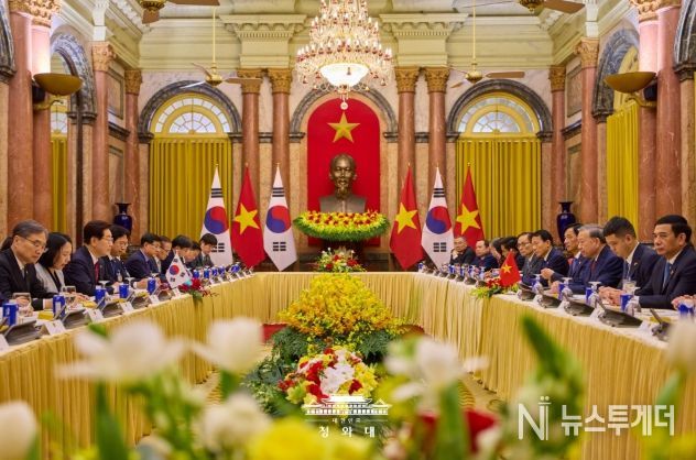 뉴스투게더 김태훈 기자 | 베트남을 국빈 방문 중인 이재명 대통령은 22일(현지시간) 오후 베트남 국가주석궁에서 또 럼 당서기장 겸 국가주석과 정상회담을 갖고, 양국 간 포괄적 전략 동반자 관계 발전 방안과 지역·국제 정세 등에 대해 심도 있게 논의했다고 이규연 청와대 홍보소통수석이 서면 브리핑했다.