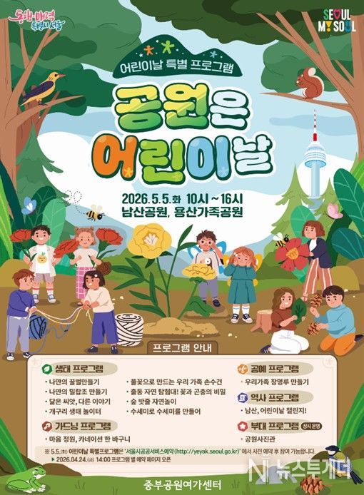 뉴스투게더 김인숙 기자 | 서울시 중부공원여가센터는 5월 5일 어린이날을 맞아 ‘남산하늘숲길’ 개방 이후 산책 명소로 많은 사랑을 받고 있는 남산공원과, 푸르른 잔디가 펼쳐진 용산가족공원에서 온 가족이 함께 즐길 수 있는 특별프로그램 '공원은 어린이날'을 운영한다고 밝혔다.