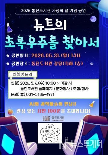 뉴스투게더 김인숙 기자 | 김포시 통진도서관이 가정의 달을 맞아 온 가족이 함께 즐길 수 있는 공연 '뉴트의 초록우주를 찾아서'를 오는 5월 31일 오후 2시 통진도서관 강당에서 개최한다.