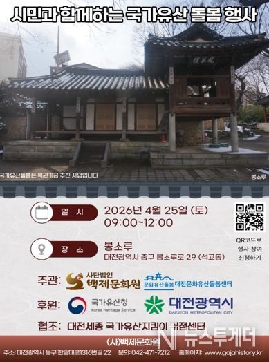 뉴스투게더 김인숙 기자 | 대전시는 대전문화유산 돌봄센터와 함께 4월 25일 오전 9시부터 12시까지 봉소루 일원에서‘시민과 함께하는 국가유산 돌봄행사’를 개최했다. 이번 행사는 2014년부터 지속적으로 추진해 온 행사로 국가유산 보존의 중요성을 널리 알리고 시민 참여를 확대하기 위해 마련됐다.
