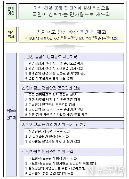 그간 민자철도는 철도수요 증가와 제한된 정부재정 하에서 민간의 자본과 창의를 토대로 철도 인프라를 효율적으로 확대하는데 기여해왔으나, ➊공사비 절감과 공기 단축 등 효율성 중심의 사업 관리, ➋시공사가 사실상 시행자 역할을 병행하며 발생하는 자기감독 구조, ➌민자사업관리를 부수적 업무로 인식하는 공공의 소극성 등으로 민자철도 안전관리가 상대적으로 소홀했다는 지적이 있었다.