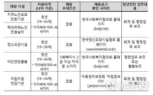 이번 모집을 통해 선발되는 479명의 청년인턴은 전국 아동·노인·정신요양 시설 등 5개 유형의 시설에서 근무하게 된다.