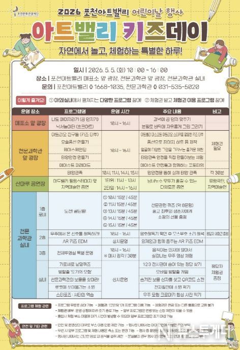 뉴스투게더 김인숙 기자 | 포천문화관광재단이 운영하는 포천아트밸리는 오는 5월 5일 어린이날을 맞아 어린이와 가족을 위한 체험형 문화행사 ‘아트밸리 키즈데이’를 개최한다.