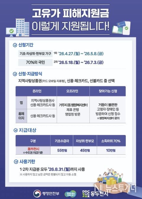 뉴스투게더 이현진 기자 | 동두천시가 중동발 고유가와 고물가로 인한 시민 부담을 완화하고 지역경제 회복을 지원하기 위해 ‘고유가 피해지원금’을 지급한다.