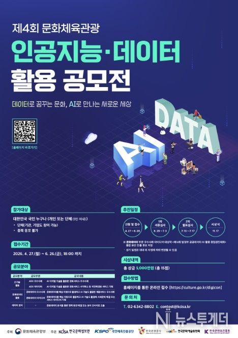 뉴스투게더 김인숙 기자 | 문화체육관광부는 한국문화정보원, 문화·체육·관광 분야 대표기관들과 함께 4월 27일부터 6월 26일까지 ‘2026 문화체육관광 인공지능(AI)·데이터 활용 공모전’을 개최한다. 이를 통해 단순 아이디어 제안을 넘어, 인공지능 기술과 문화데이터를 활용, 우리 국민의 문화생활을 한층 더 풍요롭게 만들 우수 사례를 발굴할 계획이다.