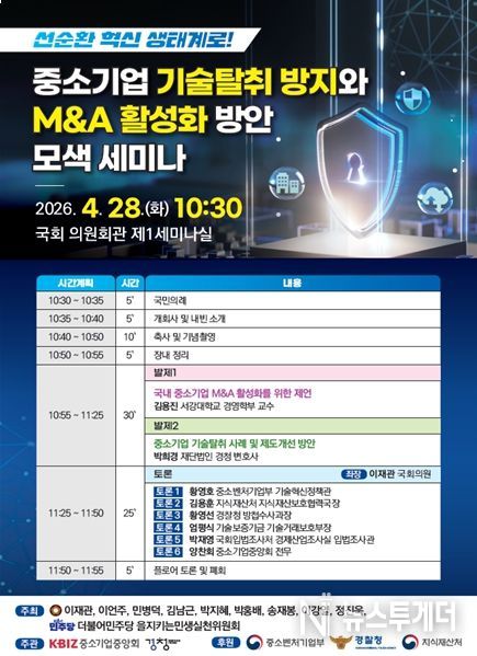 이에 이번 세미나는 중소기업의 기술탈취 사례와 M&A 활성화를 중심에 둔 만큼 김용진 서강대 경영학부 교수의 ‘국내 중소기업 M&A 활성화를 위한 제언’과 박희경 재단법인 경청 변호사의 ‘중소기업 기술탈취 사례 및 제도개선 방안’으로 발제가 이루어질 예정이다.