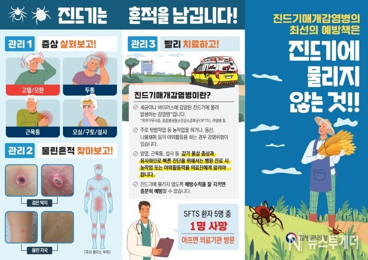 뉴스투게더 김인숙 기자 | 질병관리청은 진드기 매개 감염병인 중증열성혈소판감소증(SFTS) 환자가 4월 23일(목) 울산광역시에서 올해 처음 발생했다고 밝혔다. 첫 환자는 농작업을 하던 70대 남성으로, 현재 입원 치료 중이다. 특히, 경상북도는 2025년 SFTS 환자 수 45명으로 전국 1위를 기록하여 김천시 주민들의 각별한 주의가 요구된다.