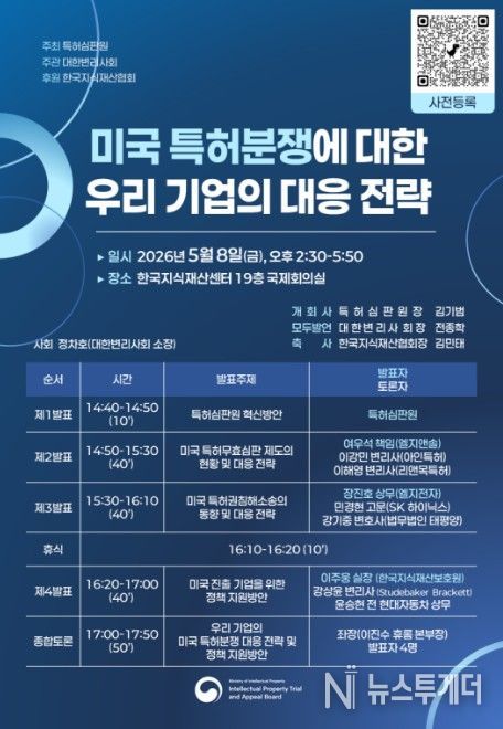 뉴스투게더 김성연 기자 | 지식재산처 특허심판원은 5월 8일 14시 30분 한국지식재산센터(서울 강남구)에서 우리 기업의 미국 특허분쟁 대응 역량 강화를 위해 '미국 특허분쟁에 대한 우리 기업의 대응전략' 발표회를 개최한다고 밝혔다.