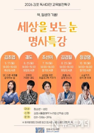 뉴스투게더 김인숙 기자 | 김포시 도서관은 2026 김포 독서대전 교육발전특구 사업으로 '세상을 보는 눈, 명사특강'을 오는 5월 17일부터 10월 18일까지 5회에 걸쳐 관내 도서관 3곳에서 진행한다.