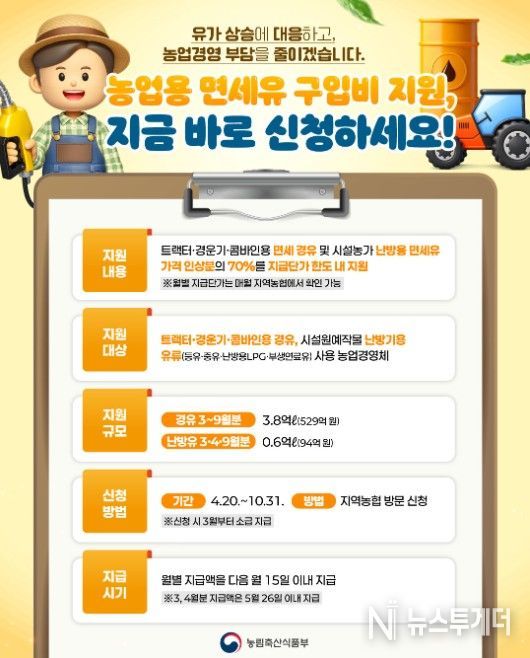 뉴스투게더 김성연 기자 | 농림축산식품부는 올해 추경예산에 반영된 농기계 3종 면세경유 유가연동보조금과 시설농가 난방용 면세유 유가연동보조금 지원 신청·접수중(4월 20일~10월 31일)에 있다고 밝혔다.