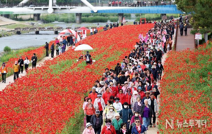 축제의 백미는 동진천변에 펼쳐진 거대한 붉은 봄꽃 군락이다. 왕복 3.3킬로미터(km) 구간을 따라 양귀비 10만 본, 작약 16만 본, 꽃잔디 8만 본을 가득 심고 끝없는 붉은 꽃물결을 빚어냈다.