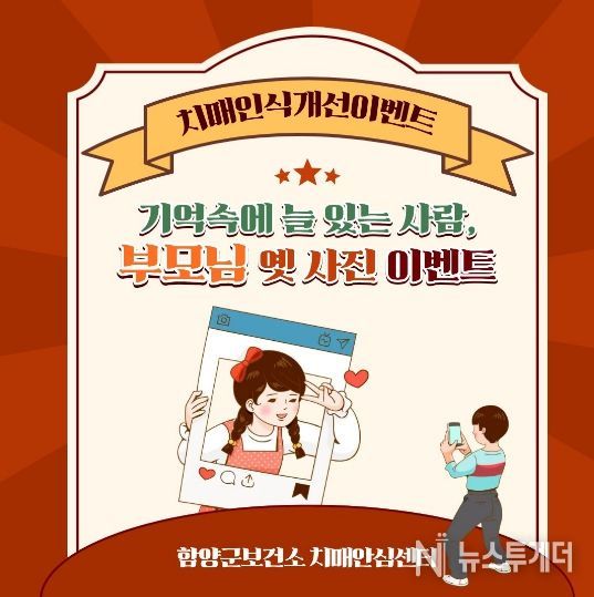 뉴스투게더 김인숙 기자 | 함양군 치매안심센터는 5월 가정의 달을 맞아 부모님의 옛 추억이 담긴 사진을 통해 감사의 마음을 전하고, 치매 예방의 중요성을 알리기 위해 ‘부모님 옛 사진 인증샷 이벤트’를 비대면으로 운영한다고 밝혔다.