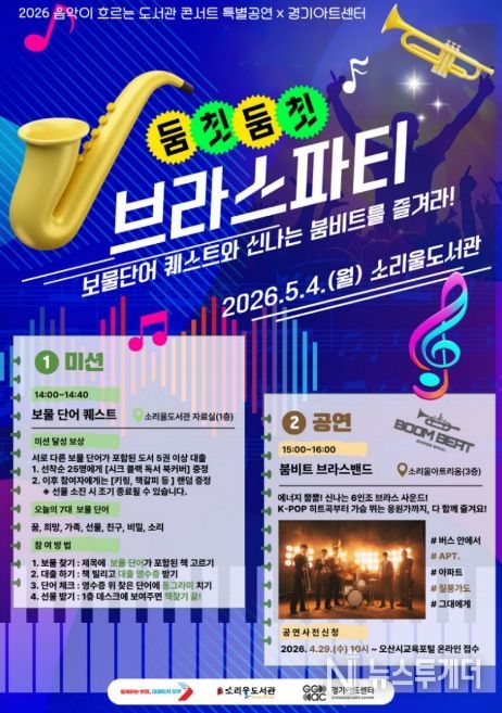 뉴스투게더 김인숙 기자 | 오산시 소리울도서관은 제104회 어린이날을 앞둔 오는 5월 4일 경기아트센터와 협업해 ‘2026 음악이 흐르는 도서관 콘서트’ 특별공연인 ‘둠칫둠칫 브라스 파티’를 개최한다고 밝혔다.
