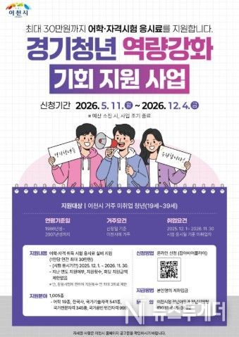뉴스투게더 이현진 기자 | 이천시가 오는 5월 11일부터 미취업 청년의 어학·자격시험 응시료를 지원하는 ‘경기청년 역량강화 기회지원 사업’ 대상자 모집에 들어간다.