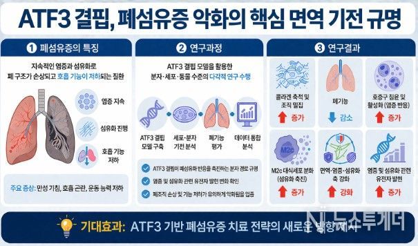 연구진은 “폐섬유화 진행 과정에서 면역세포의 염증 반응과 조직 섬유화를 동시에 조절하는 새로운 분자 기전을 규명한 것”이라며 “초기 스트레스에 반응하는 ATF3 유전자가 염증 반응의 과도한 활성화를 억제하고 폐섬유화 진행을 완화하는 핵심 역할을 수행한다는 사실을 확인했다는 점에서 의미가 있다”고 밝혔다.