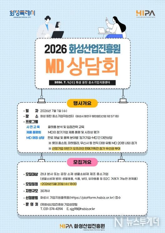 뉴스투게더 이현진 기자 | 화성산업진흥원(원장 전병선)은 화성시 생활소비재 기업의 대형 유통망 진입과 신규 판매채널 확보를 지원하기 위해 ‘2026년 화성산업진흥원 MD 상담회’를 개최하고, 오는 5월 20일까지 참여기업을 모집한다.