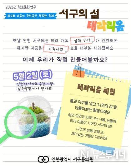 뉴스투게더 김인숙 기자 | 인천광역시 서구문화원은 오는 5월 2일 인천아시아드주경기장 남측광장에서 열리는 제9회 아동이 주인공인 행복한 축제’에서 ‘서구의 섬, 테라리움 만들기’ 체험 부스를 운영한다고 밝혔다.