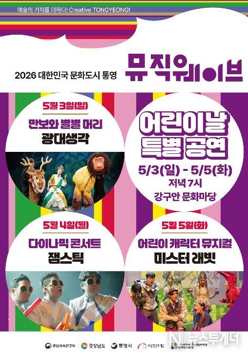 뉴스투게더 김인숙 기자 | (재)통영문화재단은 어린이날을 맞아 오는 5월 3일부터 5일까지 3일간 오후 7시 강구안 문화마당에서 2026 뮤직웨이브 어린이날 특별공연‘만보와 별별머리’,‘다이나믹 콘서트’,‘미스터 래빗’을 진행한다.