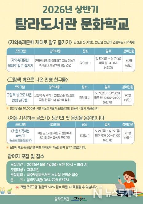 뉴스투게더 김인숙 기자 | 제주시 라도서관은 시민들의 문화 감수성 함양과 문화 향유 기회 확대를 위해 2026년 상반기 ‘탐라도서관 문화학교’ 참여자를 5월 4일부터 모집한다.