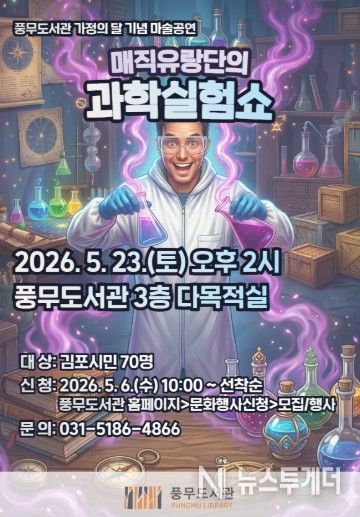 뉴스투게더 김인숙 기자 | 김포시 풍무도서관에서는 5월 23일 오후 2시부터 3시까지 마술공연 ‘매직유랑단의 과학실험쇼’를 운영한다. 가정의 달을 맞아 도서관 이용 가족에게 특별한 문화 향유 기회를 제공하고자 기획된 공연이다.
