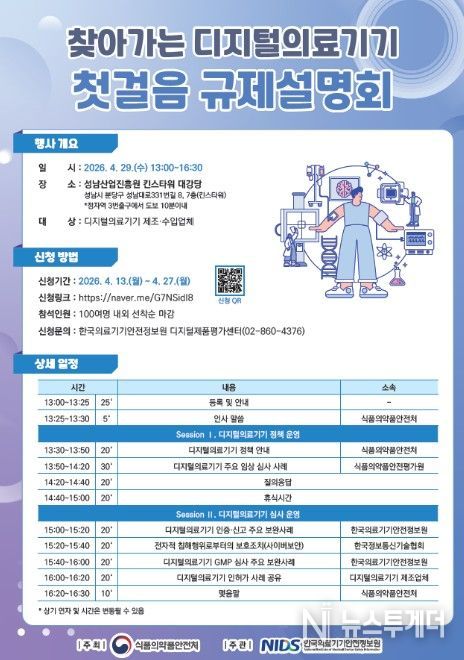 뉴스투게더 김성연 기자 | 식품의약품안전처는 디지털의료기기 분야 청년 기업이 밀집한 지역을 직접 찾아가 현장의 목소리를 청취하는 ‘찾아가는 규제설명회’를 4월 29일 성남산업진흥원 킨스타워(경기도 성남시 소재)에서 개최한다고 밝혔다.