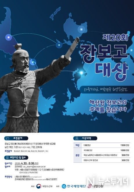 뉴스투게더 김태훈 기자 | 해양수산부는 4월 30일부터 8월 6일까지 ‘제20회 장보고대상’ 후보자를 공모한다고 밝혔다.