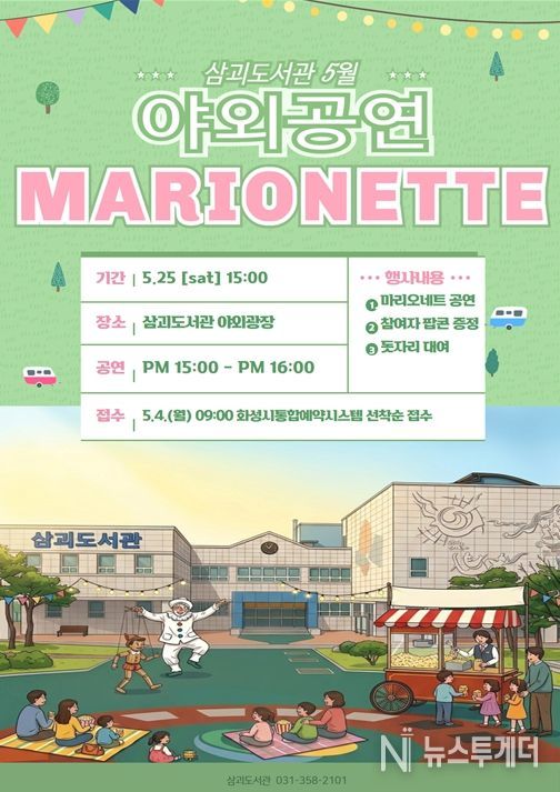 뉴스투게더 김인숙 기자 | 화성시립 삼괴도서관은 5월 가정의 달을 맞아 오는 5월 23일, 도서관 야외광장에서 가족 단위 이용자를 위한 특별한 문화행사를 운영한다. 따뜻한 봄날의 야외 공간에서 누구나 편안하게 즐길 수 있도록 마련된 이번 행사는 도서관을 찾는 시민들에게 색다른 문화 경험과 여유로운 시간을 제공할 예정이다.