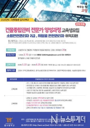 뉴스투게더 이현진 기자 | 고양특례시는 중장년과 청년 미취업자의 재취업을 지원하는 2026년 고양맞춤형 일자리학교의 일환으로, ‘건물종합관리 전문가 양성과정’에 참여할 교육생을 모집한다고 29일 밝혔다.