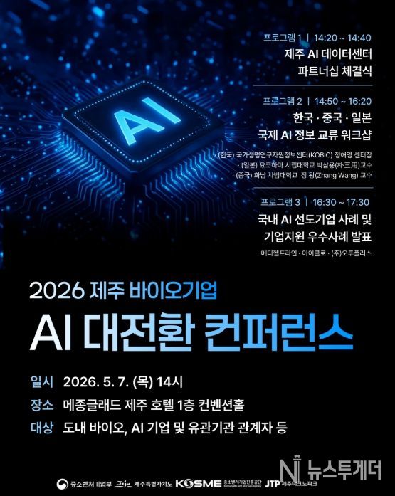 뉴스투게더 김인숙 기자 | 제주테크노파크(원장 지영흔, 제주TP)는 오는 5월 7일 오후 2시 메종글래드 제주 호텔에서 도내외 바이오 및 AI 산업 관계자 100여 명을 대상으로 ‘제주 바이오기업 AI 대전환(DX) 컨퍼런스’를 개최한다고 30일 밝혔다.