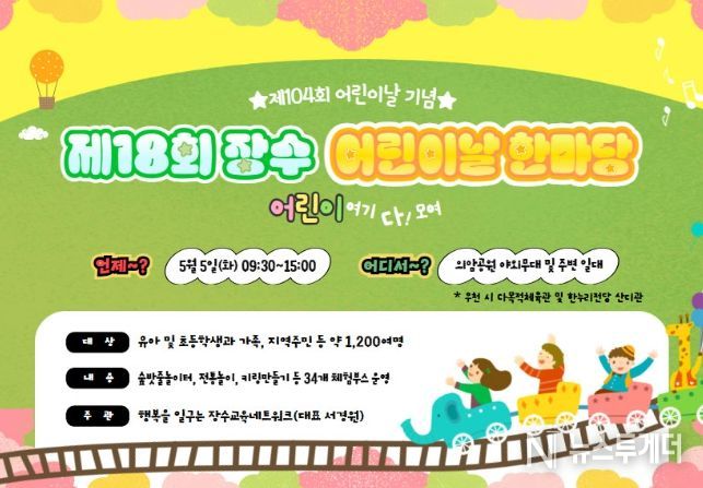뉴스투게더 김인숙 기자 | 장수군은 제104회 어린이날을 맞아 5월 5일 오전 9시 30분부터 오후 3시까지 장수의암공원 일원에서 ‘제18회 어린이날 한마당 행사’가 개최된다고 밝혔다.