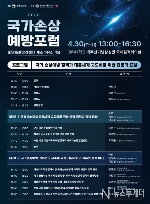 뉴스투게더 김인숙 기자 | 질병관리청은 중앙손상관리센터 개소 1주년을 맞아 4월 30일 고려대학교 백주년기념삼성관에서 「2026년 국가손상예방포럼」을 개최한다.
