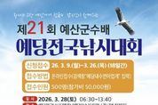 뉴스투게더 김인숙 기자 | 예산군은 오는 3월 28일 예당전국낚시대회장에서 ‘제21회 예산군수배 예당전국낚시대회’를 개최한다고 밝혔다. 군에 따르면 예당전국낚시대회는 전국의 낚시 동호인과 관광객이 함께 어우러지는 민물낚시대회로 국민의 레저 수요를 충족하고 지역경제 활성화에도 기여할 것으로 기대된다. 참가 신청은 3월 9일부터 3월 26일까지 선착순 500명을 대상으로 접수한다. 대회 참가를 희망하는 사람은 예당내수면어업계 누리집을 통해 신청할 수 있으며, 참가비는 1인당 5만 원이다. 대회 시상은 1위 트로피와 상금 500만 원, 2위 200만 원, 3위 100만 원이 수여되며, 이와 함께 여자우수상, 최대어상, 외래어종 퇴치상, 최고령상, 원거리상 등 다양한 특별상이 마련된다. 또한 시상 외에도 추첨을 통해 참가자들에게 다양한 경품이 제공될 예정이다. 이 밖에도 참가자 전원에게 중식을 제공하며 광시한우 구이 시식코너 등 다양한 부대행사도 함께 운영할 계획이다. 군 관계자는 “출렁다리와 모노레일, 예당호를 배경으로 한 무빙보트 수상체험 등 다양한 볼거리와 체험거리가 마련돼