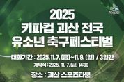 뉴스투게더 김인숙 기자 | 충북 괴산군은 오는 11월 7일부터 9일까지 3일간 괴산스포츠타운과 청소년수련원 축구장에서 ‘2025 자연울림괴산 전국 유소년축구대회’를 개최한다고 30일 밝혔다. 이번 대회는 (사)한국유소년축구협회와 괴산군체육회가 공동 주최하고, (사)한국유소년축구협회 및 괴산군축구협회가 주관한다. 전국 각지에서 총 70개 팀, 선수 및 임원, 학부모 등 2,000여 명이 참가할 예정이다. 특히 7일 오후 2시에는 괴산스포츠타운 준공식과 함께 개막식이 열리며, 개막 이후 첫 경기로는 괴산군 대표팀인 강호FC가 출전해 대회의 시작을 알린다. 경기는 학년별로 나뉘어 진행된다. 초등 1~3학년부는 6인제, 4~6학년부는 8인제 방식으로 운영되며, 경기의 공정성과 안전성을 확보하기 위해 전문 심판진과 운영 요원이 배치된다. 대회 우승팀에게는 필리핀 뉴클락시티에서 열리는 국제대회 및 동계 해외전지훈련 무상 참가 자격이 주어지며, 이를 통해 선수들이 국제무대 경험을 쌓고 기량을 향상시킬 수 있을 것으로 기대된다. 또한, 이번 대회는 단순한 스포츠 행사를 넘어 지역경제 활성