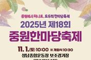 뉴스투게더 김인숙 기자 | ‘제18회 중원한마당축제’가 오는 11월 1일 오전 10시부터 오후 2시 30분까지 2000여 명이 참석한 가운데 성남종합운동장 보조경기장에서 열린다. 성남시 중원구가 후원하고, 중원한마당축제 추진위원회가 주최·주관해 열리는 이번 행사는 ‘중원에서 하나로, 모두의 한마당 축제’를 주제로 진행된다. 이날 특설무대에선 11개 동 주민 대표가 출연해 넘치는 끼와 노래 실력을 선보이는 ‘우리 동네 인기스타’ 공연이 펼쳐진다. 초청 가수 윤수현의 ‘천태만상’ 등 트로트 공연, 신인 아이돌 걸그룹 아스텔의 ‘슈퍼노바’, ‘아일랜드’ 등의 공연, 중원유스센터 청소년 보컬 동아리와 댄스 동아리 공연도 열려 축제 분위기를 달군다. 시민 체험 행사도 다양하다. 행사장 곳곳에 총 11개 체험 부스를 설치해 4차산업과 관련한 드론 축구, 가상현실(VR) 트럭 체험, 배틀 로봇 등과 페이스페인팅, 목공 체험 등을 해볼 수 있다. 중원구 관계자는 “주민 간 화합을 도모하고, 신나고 활기찬 지역 분위기를 조성하는 장이 될 것”이라고 말했다.