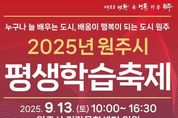 뉴스투게더 장영주 기자 | 원주시 평생교육원 학습관은 오는 13일 건강문화센터 일원에서 ‘누구나 늘 배우는 도시, 배움이 행복이 되는 도시 원주!’를 주제로 ‘2025년 원주시 평생학습축제’를 개최한다. 이번 축제는 식전공연을 시작으로 오전 10시에 개막식이 열린다. 오전에는 이진관 가수의 ‘평생학습으로 아름답게 완성하는 인생’ 평생학습 특강과 학습관 성인문해 학습자들의 문해 퀴즈·장기자랑 공연이 진행되며, 오후에는 나여정 가수의 특별공연과 사물놀이, 색소폰, 하모니카, 댄스, 합창 등 13개 평생학습동아리 팀의 다채로운 공연이 펼쳐질 예정이다. 또한 가족, 연인, 친구들과 함께 즐길 수 있는 나만의 아이스크림 풍선, 가죽 이니셜 액세서리, 향수 만들기, 이침, 재봉틀 체험 등 20여 가지 다채로운 체험 부스도 운영된다. 본행사에 앞서 8일부터 13일까지 6일간 건강문화센터 1층 로비와 7층 전시실에서는 전시회가 진행된다. 문해학습자 시화전과 서예, 민화, 캘리그라피, 아크릴화, 가죽공예, 라탄공예 등 학습관 강사와 수강생, 일반 작가들의 작품 250여 점이 전시된다. 공연과 전시는 무료로 관람할
