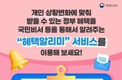뉴스투게더 장은미 기자 | 딩동! 몰라서 못 받은 정부 혜택 이제는 놓치지 마세요! '혜택알리미' 아래 앱에서 쉽게 이용하세요! - 정부24, 신한은행, 기업은행, 하나은행, 우리은행, 웰로 ※ 혜택알리미란? 소득, 거주지 등 개인의 상황을 파악하여 받을 수 있는 공공서비스(정부 지원 정책)를 찾아 안내해 주는 알림서비스