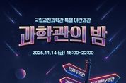 뉴스투게더 김인숙 기자 | 과학기술정보통신부 국립과천과학관은 개관 17주년을 맞아 11월 14일 18:00부터 22:00까지 상설전시관을 무료로 개방하는 ‘과밤(科밤)’ 특별 야간 개관 행사를 개최한다. 특히, 이번 행사는 국립과천과학관 개관 이후 처음 진행되는 상설전시관 야간 개방이며, 퇴근 후에도 부담 없이 즐길 수 있는 야간 종합 과학문화 프로그램으로 전시 해설, 체험, 과학공연, 천문관측, 먹거리 차(푸드트럭) 등 온 가족이 함께하는 콘텐츠로 구성했다. 야간 시간 동안 관람객은 전시관 자율관람과 더불어 전문해설사가 진행하는 전시 해설을 들을 수 있으며, 중앙홀 2층에는 만들기 체험 5종과 전시 연계 체험구역(체험존)이 꾸려져 연령대별로 과학 원리를 직접 체험할 수 있다. 중앙홀 1층에서는 과학 마술쇼와 가족 퀴즈 타임이 진행되고, 천체투영관 영상 상영과 천문대의 야간 관측 프로그램도 운영된다. 야외전시장에는 먹거리 차(푸드트럭) ‘야이구역(야미존)’이 마련되어 간단한 간식과 음료를 즐길 수 있다. 국립과천과학관은 행사 시간 중 무료입장 및 주차를 제공하고, 관람 동선을 고려한 안전·질서 유도 인력을 배치
