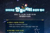 뉴스투게더 김인숙 기자 | 제주별빛누리공원은 12월 13일 ‘2025 쌍둥이자리 유성우행사’를 개최한다. 쌍둥이자리 유성우는 매년 12월 소행성 3200파에톤(Phaethon)의 파편이 지구 대기와 충돌하며 많은 별똥별이 보이는 현상을 말한다. 올해는 12월 14일 오후 4시 21분경이 극대기로 전날인 13일 밤에 눈으로 관측하기 좋을 것으로 예상된다. 특별히 이번 행사에서는 쌍둥이임을 확인할 수 있는 신분증, 주민등록등본 등을 제시하면 제주별빛누리공원 입장료가 면제된다. 당사자가 미취학 어린이일 경우에는 별도 만들기 체험권도 추가로 제공해 가족 단위 방문객의 참여를 독려할 예정이다. 실내 프로그램으로는 어린이들이 과학을 쉽고 재미있게 접할 수 있도록 구성한 ‘과학 마술 공연’이 오후 4시와 7시 두 차례 진행된다. 참여를 원하는 도민과 관광객은 12월 5일 오후 7시부터 제주별빛누리공원 누리집을 통해 사전 신청할 수 있으며, 참가비는 1인당 1,000원이다. 또한 당일 입장권을 제시하면 누구나 참여할 수 있는 ‘미션 체험’ 프로그램이 오후 3시부터 밤 9시까지 상시 운영된다. 참가자들